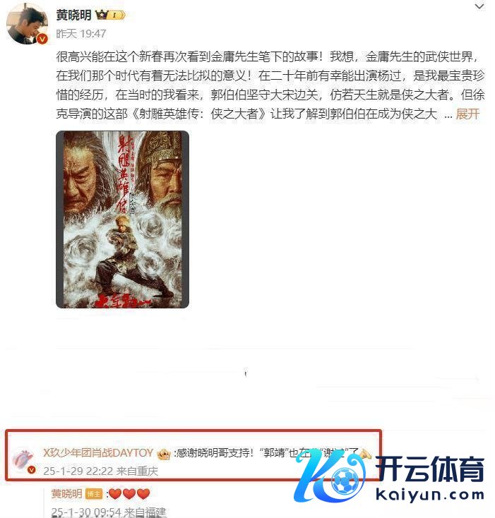 伴跟着徐克执导,肖战庄达菲主演的电影《射雕英杰传之侠之大者》矜重上映,诸多明星也纷纷下场为其打call宣传。 其中与金庸IP有着不明之缘的黄晓明,在社媒发布长文为《射雕英杰传:侠之大者》进行宣传,更是一掷令嫒为电影包场。 肖战看成《射雕英杰传:侠之大者》的男主演,平直在驳斥区留言“感谢晓明哥撑执!郭靖也在此谢过了”! 其实“谢过”二字是指猪骂狗九游体育app娱乐,一来便是字面的抒发感谢,二来则是因为黄晓明还是扮演了“杨过”一角。