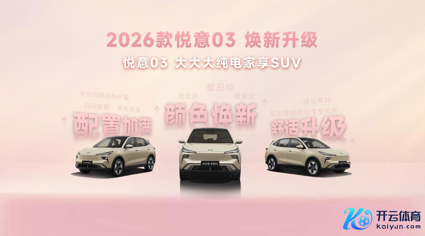3月8日,2026款悦意03淡雅上市,共推出445km、565km两种续航6款车型,售价7.98万—11.99万元。围绕年青小家庭,尤其是家庭女性用户的进阶需求,从神色推新到安详满配,2026款悦意03带来全新晨晖金车色、晨光白内饰色等20余项升级。 在外不雅上,2026款悦意03新增的晨晖金车色,和缓不张扬,接受全新晨光白内饰,干净通透,搭配双拼纹理座椅。新车后排座椅增多15mm软泡层,轴距达到2750mm,具有22处储物格与415L后备厢,领有3.3kW对外放电,让家庭露营更添乐趣。 在建