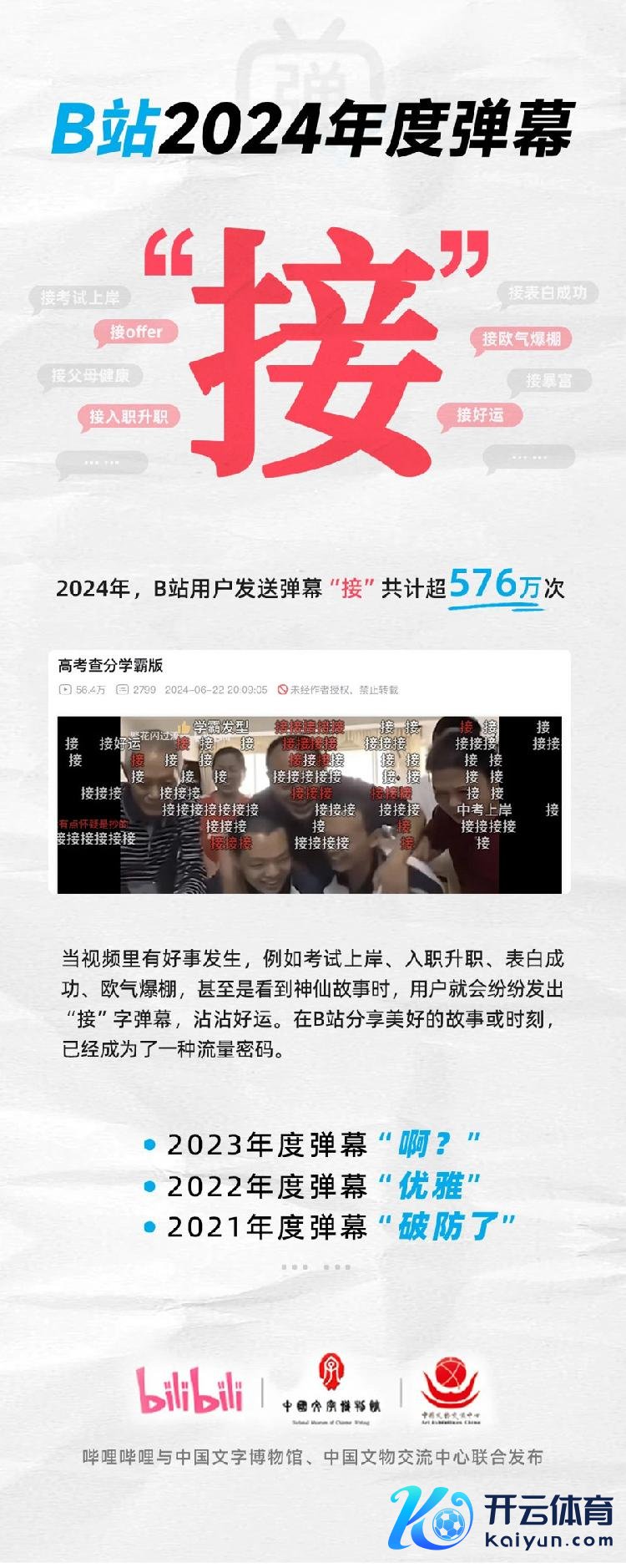 本周,哔哩哔哩(B站)与中国文物不异中心、中国笔墨博物馆集结发布的2024年度弹幕为“接”。2024年,B站用户累计发送“接”超576万次。