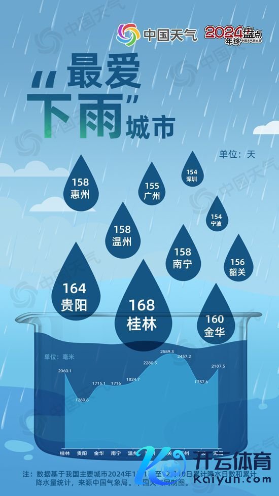华南地区向来是降水最充沛、台风最爱重的区域。2024年最爱下雨城市排名榜上,华南地区包揽六席,其中,桂林以168天降水日数摘得桂冠,南宁、惠州、韶关、广州、深圳也榜上着名,这些城市的累计降水量也多在2000毫米以上,都是雨神额外偏疼之地。