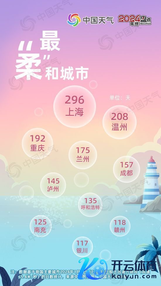 如若说朔方城市的阳光更明媚,那南边的风终究是温婉轻柔几分。从2024年最“柔”和城市盘货来看,上海、温州、重庆排名前三甲,尤其是上海极大风速在三级以下的日数高达296天,可谓一骑绝尘。