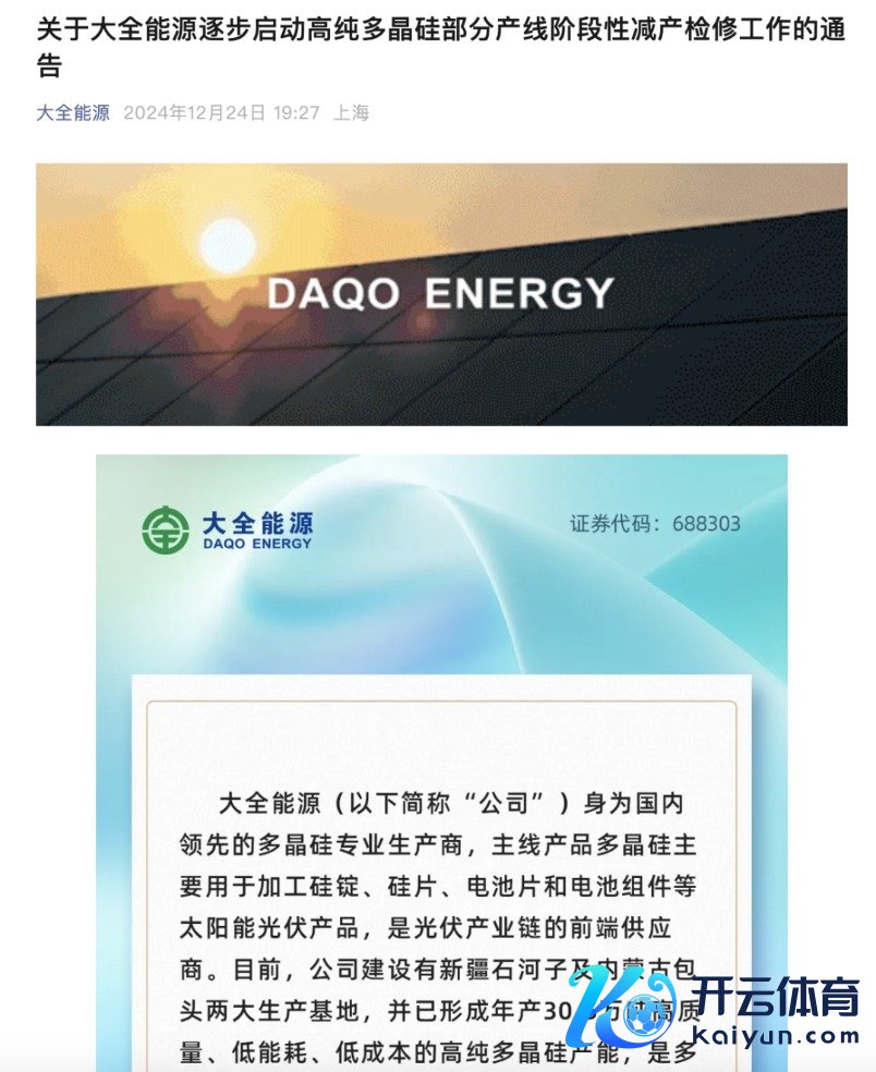 在通威股份、大全动力宣布有序减产控产后,有音尘称,另一家多晶硅巨头企业——协鑫科技也将于近日宣布有序减产。 对此,协鑫科技方面朝上海证券报记者回答称,公司坚强守旧行业自律,有分娩标的变动会实时公告。 12月25日,中国有色金属工业协会硅业分会发布多晶硅周评称,企业公告老到减产,硅料价钱小幅回升。 硅业分会示意,通威股份与大全动力均发布老到减产公告,标记着多晶硅头部企业矜重参预低负荷运转阶段。字据调研,通威股份的老到标的在11月就也曾开动渐渐鼓舞,于12月有清澈体现,而大全动力在其三季度陈说中也