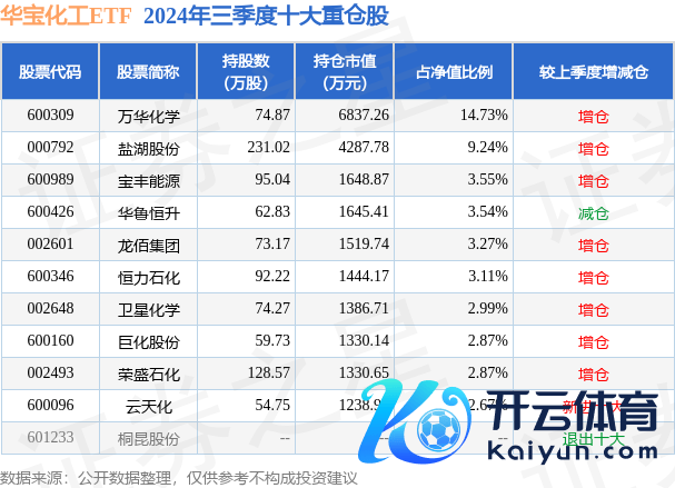 华宝化工ETF为指数型-股票基金,把柄最新一期基金季报解析,该基金钞票设立:股票占净值比99.04%,无债券类钞票,现款占净值比1.13%。基金十大重仓股如下: