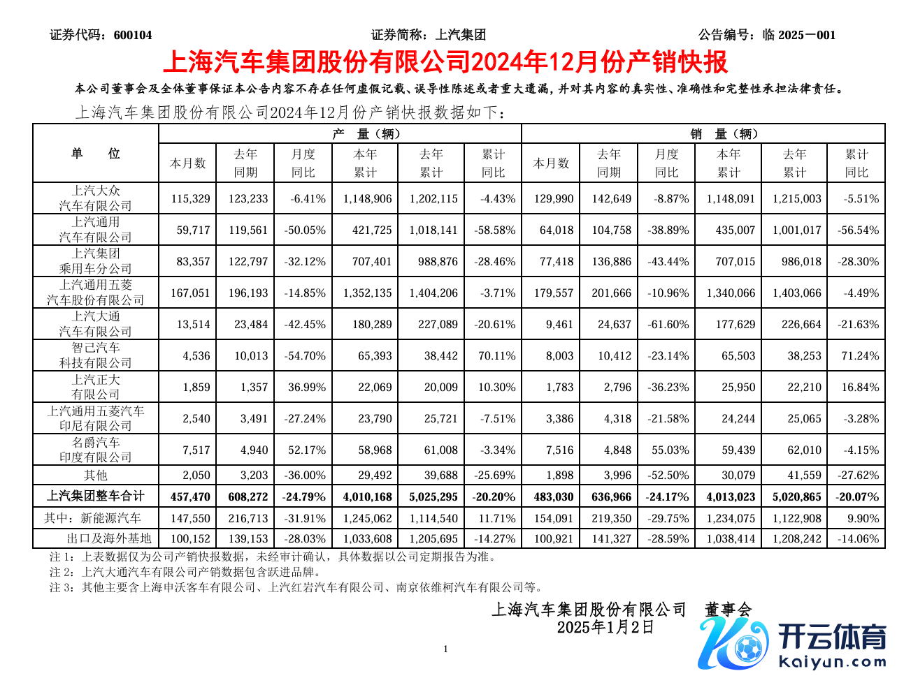 IT之家 2 月 19 日音问九游体育官网登录入口,据华尔街见闻报谈,上汽乘用车日前公布《对于大乘用车干部任免的见知》,对乘用车板块干部大限度任免,触及超 60 位中高层,任免由上汽集团总裁贾建旭签发,2 月 12 日起成功。 爆料的文献截图涌现,本次干部任免触及荣威、名爵、飞凡等中枢品牌,还将研发、营销、产物等部门纳入重组边界。 IT之家查询上汽集团官方泄露公告获悉,上汽集团 2024 年整车总共销量 4,013,023 辆,累计同比下滑 20.07%。从具体品牌来看,除了智己汽车、上汽廉明