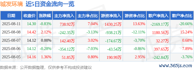 本站音讯,铁心2025年8月11日收盘,城发环境(000885)报收于14.3元,下落0.83%,换手率1.15%九游体育app娱乐,成交量7.35万手,成交额1.05亿元。