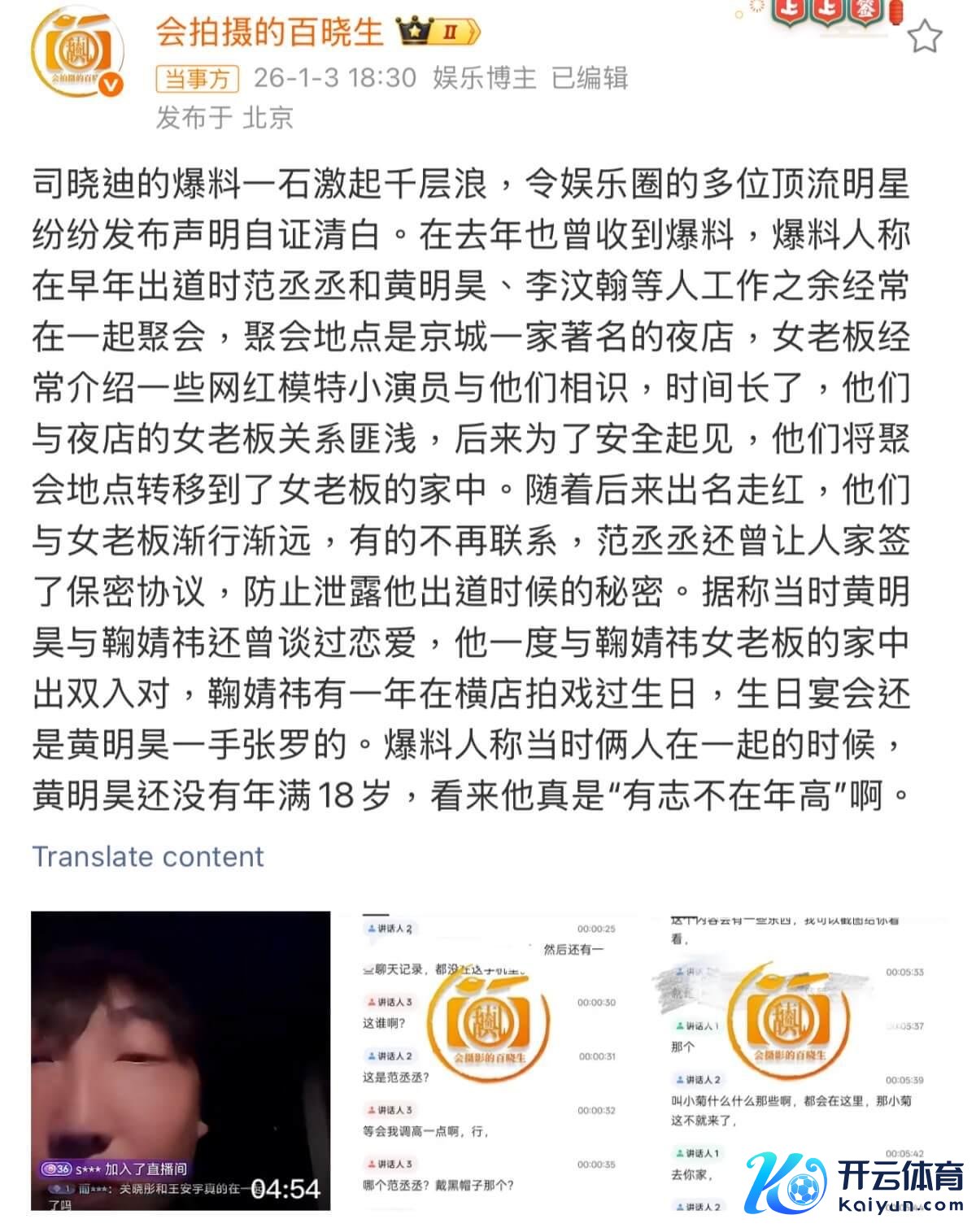 103事变又有新瓜九游体育app娱乐,此次男主角们和司晓迪的也曾并吞批,诀别是和,只不外女主确实是出了名的绯闻绝缘体! 没错,有狗仔直播要爆料范丞丞、黄明昊和小橘,男艺东谈主平直报大名,但女艺东谈主罗致了奶名,其后补上一句四千年,锤了女主是鞠婧祎! 狗仔暗意这几东谈主之前一直在一家酒吧雇主娘家中疏浚,范丞丞和雇主娘有签过守密公约,不成以公开这些音问! 而狗仔爆料黄明昊未成年时,就和鞠婧祎往复过,某一年女方在横店过寿辰,寿辰会也曾黄明昊细致张罗。 来看爆料文: 收支八岁,看起来毫无杂乱的两东谈主