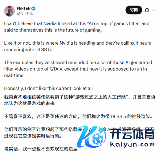 英伟达 DLSS 5.0 “及时神经渲染” 技巧公布后马上引爆游戏圈,这家显卡巨头将其标榜为 “图形范围改日中枢观念”,可本体演示成果与宣传口径却激励玩家与业内的宏大争议,社区不雅点呈现昭彰对立,从画质审好意思到行业发展的狡计捏续发酵。 科技媒体 NikTek 最初发声吐槽,直言无法交融的方案,称其看着这款 “重复在游戏之上的 AI 滤镜” 却确定这是游戏的改日走向,还将演示成果类比为《三男一狗》的 AI 生成滤镜视频,并明确默示全齐不收受面前的呈现成果。这条推文得回超高感情度,成为这次争议的