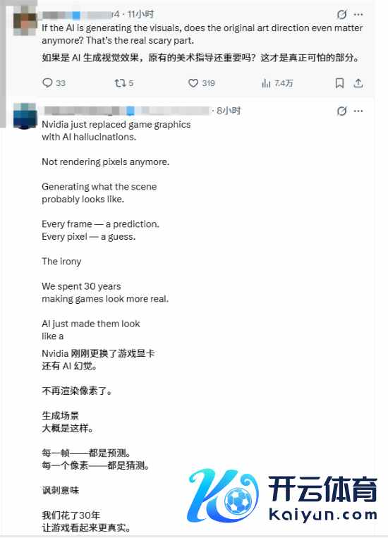 有玩家提议质疑,若 AI 全权生成视觉内容,游戏原生好意思术观念是否还有存在的意旨,原有的艺术创作逻辑是否会被透顶颠覆;也有玩家指出,英伟达此举可能进一步鼓动云游戏布局,改日玩家简略无法在 PC 端径直体验 DLSS 5.0 的完好成果,反而要依赖厂商的职业器职业。