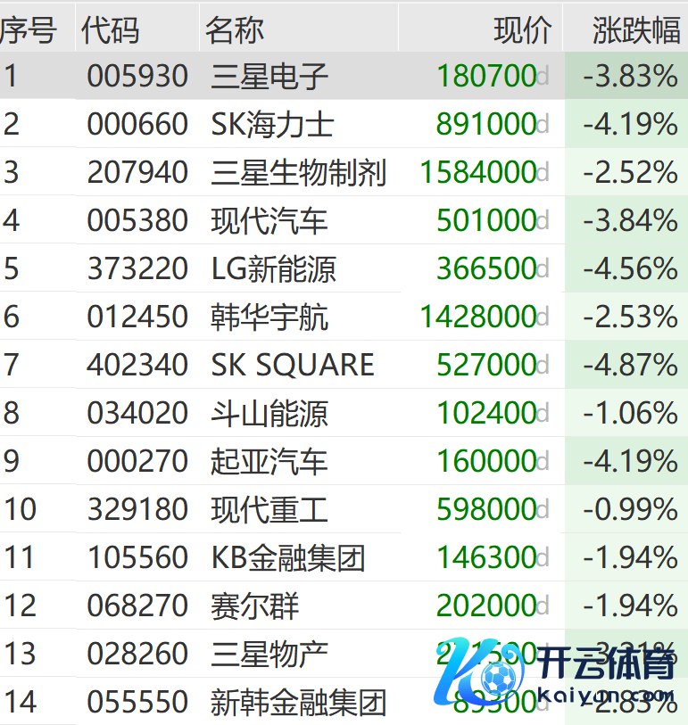 个股方面,三星电子、SK海力士、当代汽车、LG新动力等权重股均有明显跌幅。
