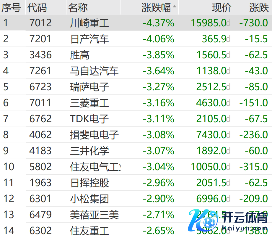 日股汽车、电子等板块跌幅居前,川崎重工、日产汽车、胜高、马自达汽车等领跌日经225指数成份股。