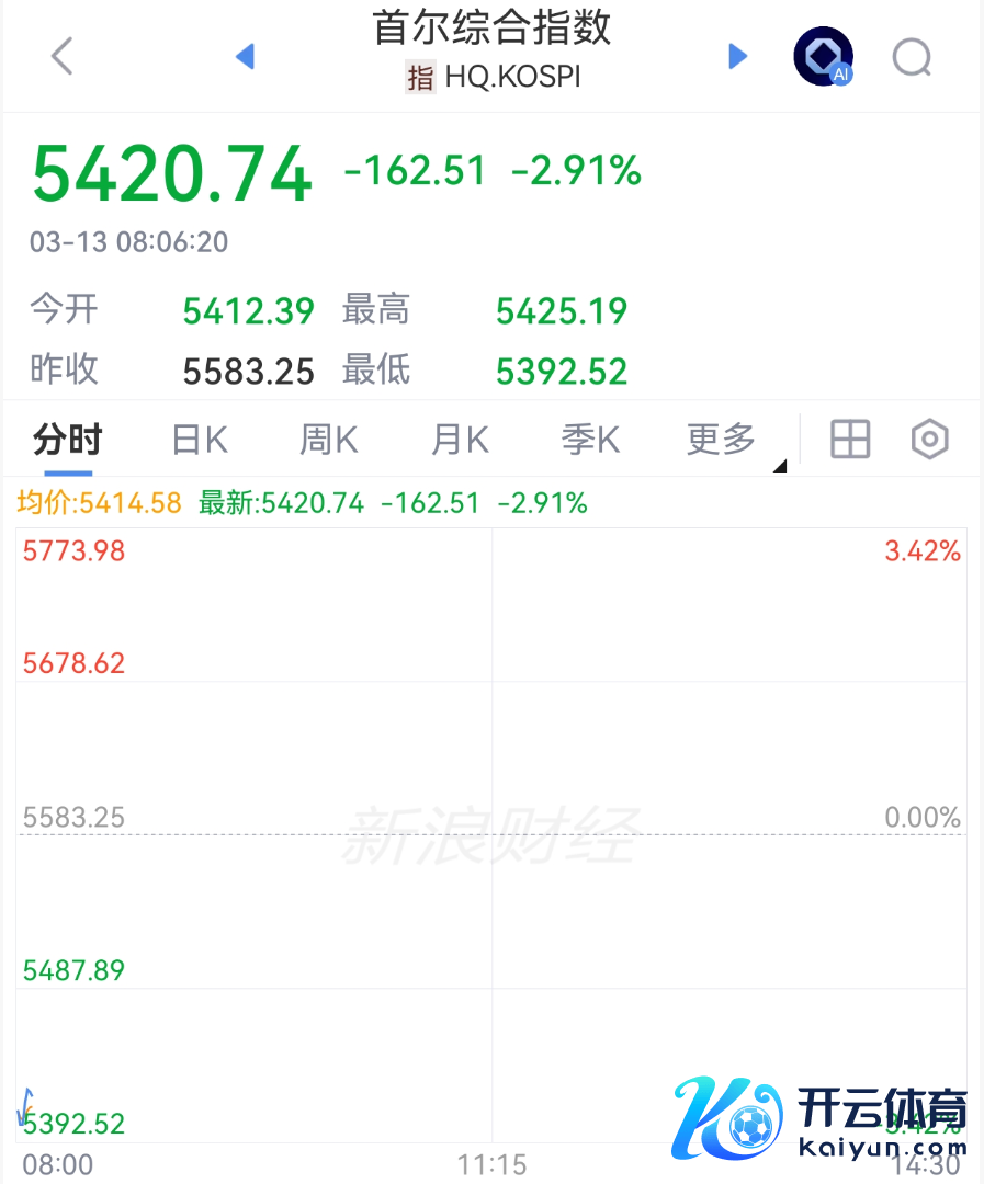 3月13日,韩国详尽指数开盘报5412.39点,下降3.1%。扫尾发稿,跌幅仍近3%。