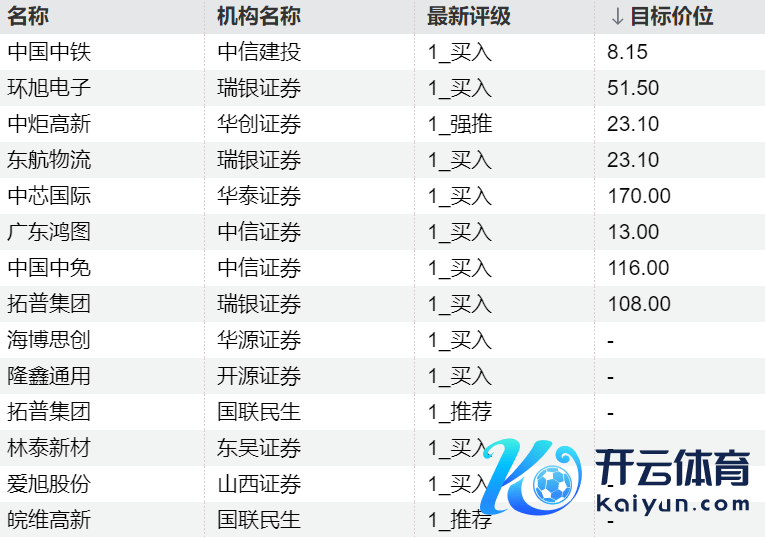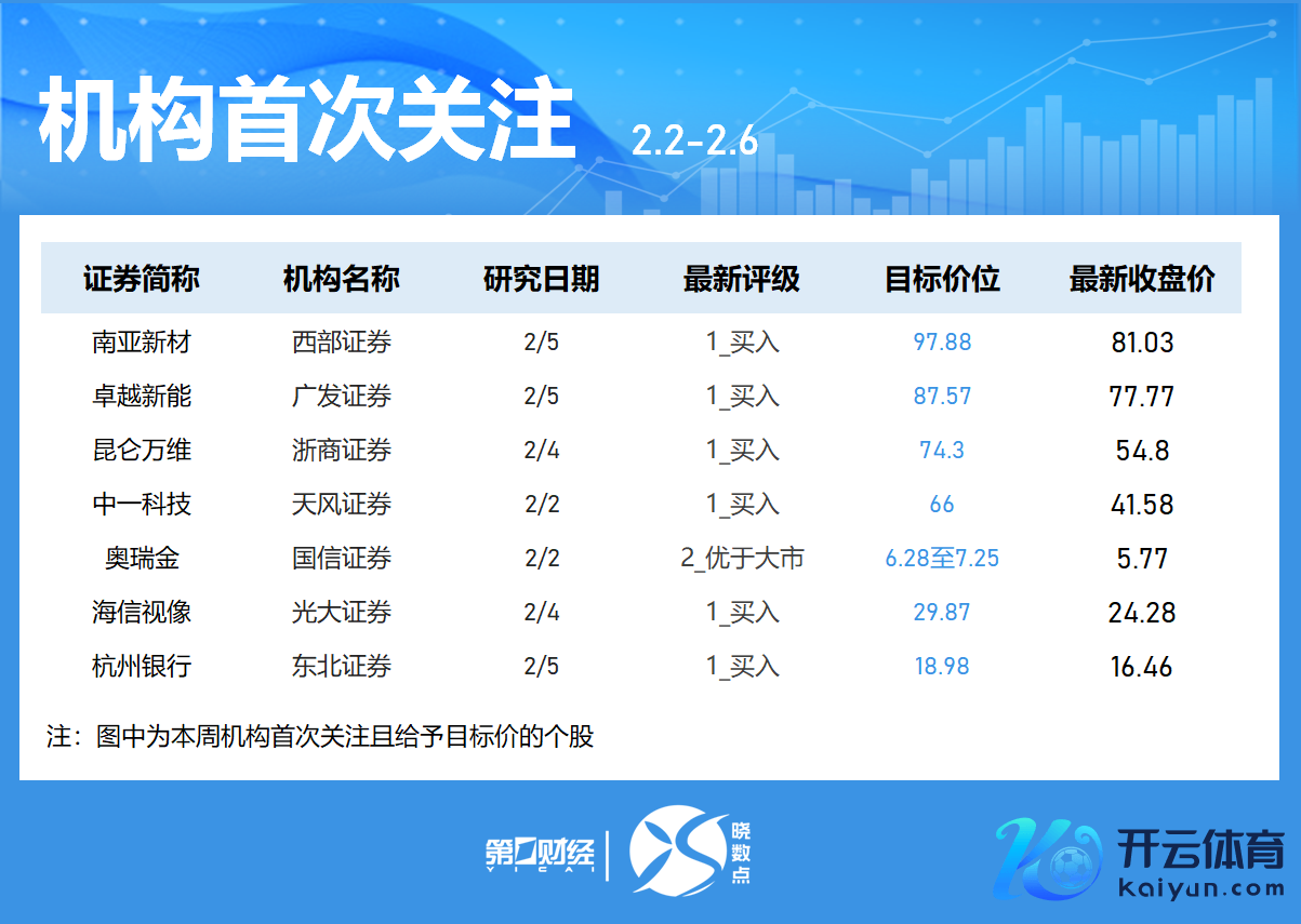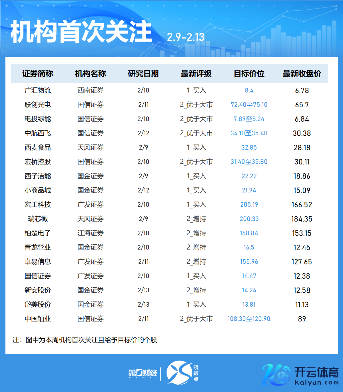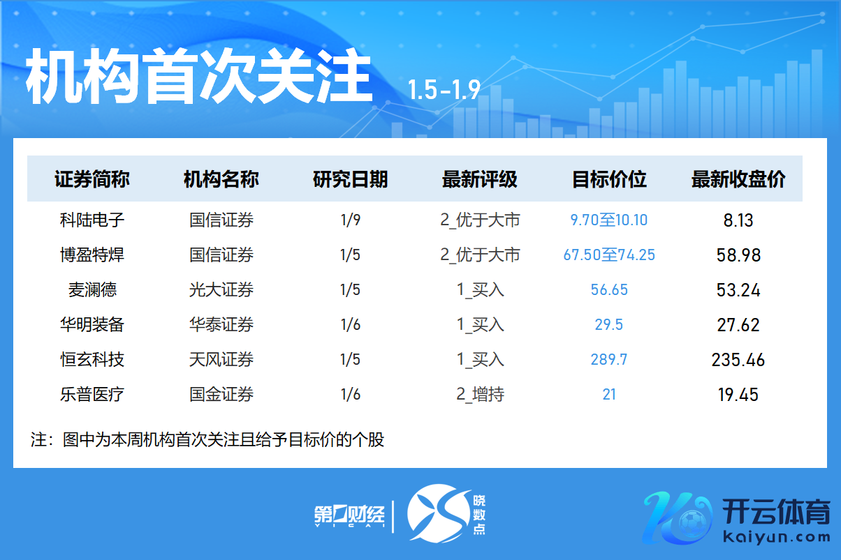 Wind数据表示,机构本周初度慈祥51只个股,其中7股被赐与指标价。-凯格精机获广发证券赐与“买入”评级,指标价为207.84元,该股最新收盘价为163.84元;-大秦铁路获天风证券“增握”评级,指标价为5.95元,最新收盘价为5.31元;-麦加芯彩获国金证券赐与“买入”评级,指标价为67.19元,该股最新收盘价为50.13元;-东北证券、瑞芯微、龙佰集团等股本周均获机构初度慈祥。