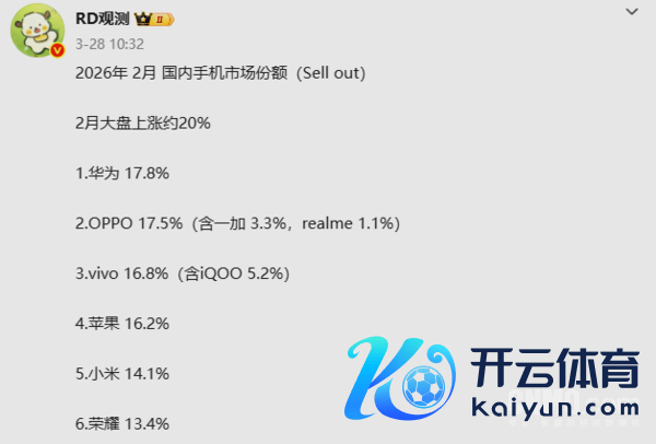 【CNMO科技音问】据CNMO了解,数码博主“RD不雅测”公布的2026年2月国内手机商场份额数据暴露,华为以17.8%的份额位居第一,OPPO系(含一加、realme)以17.5%紧随后来,vivo系(含iQOO)以16.8%位列第三,苹果以16.2%滑落至第四,小米和荣耀区分为14.1%和13.4%。