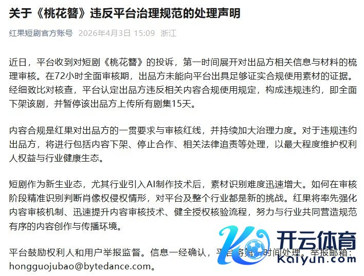 4月3日,红果短剧官方账号发布声明:近日,平台收到对短剧《桃花簪》的投诉,第一时辰伸开对出品方干系信息与材料的梳理审核。在72小时全面审核期,出品方未能向平台出具饱胀阐明合规使用素材的根据。经细巧比对核查,平台认定出品方违抗干系践诺合规使用规章,组成违纪失言,即全面下架该剧,并暂停该出品方上传总共剧集15天。