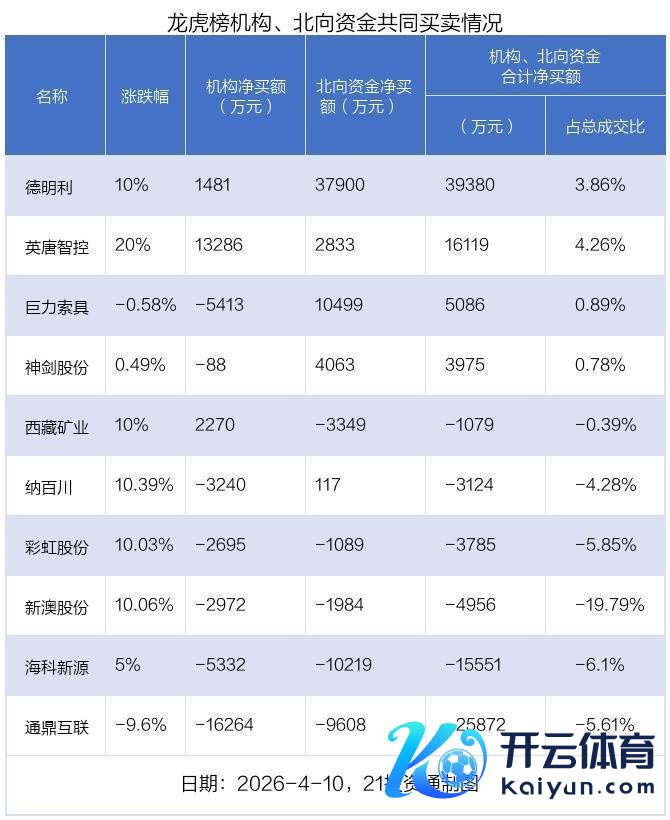 4月10日,上证指数高潮0.51%,深证成指高潮2.24%,创业板指高潮3.78%。盘后龙虎榜数据浮现,共有40只个股因当日异动登上龙虎榜,资金净流入最多的是德明利(001309.SZ),达4.93亿元。 据21投资通智能监测,20只个股龙虎榜出现了机构的身影,北向资金参与龙虎榜中的个股共触及18只。 4.93亿资金抢筹德明利,4.08亿资金出逃通鼎互联 40只上榜的龙虎榜个股中,18只个股被净买入,22只个股被净卖出。其中,资金净买入最多的是德明利,达4.93亿元,占总成交金额的4.84%。