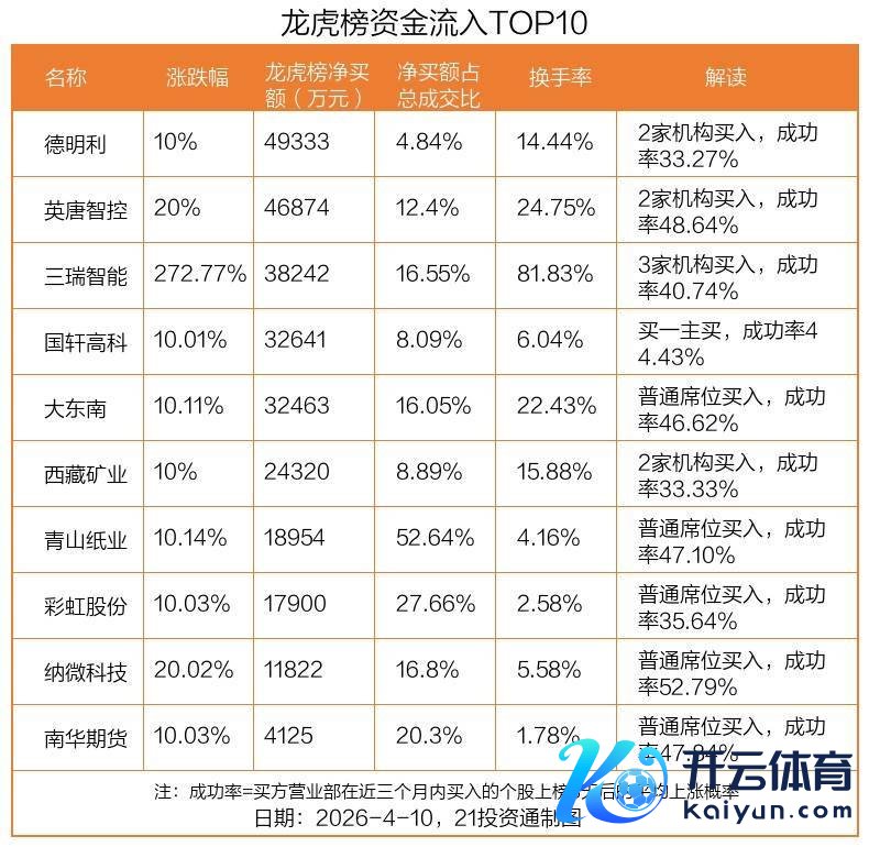 4月10日,上证指数高潮0.51%,深证成指高潮2.24%,创业板指高潮3.78%。盘后龙虎榜数据浮现,共有40只个股因当日异动登上龙虎榜,资金净流入最多的是德明利(001309.SZ),达4.93亿元。