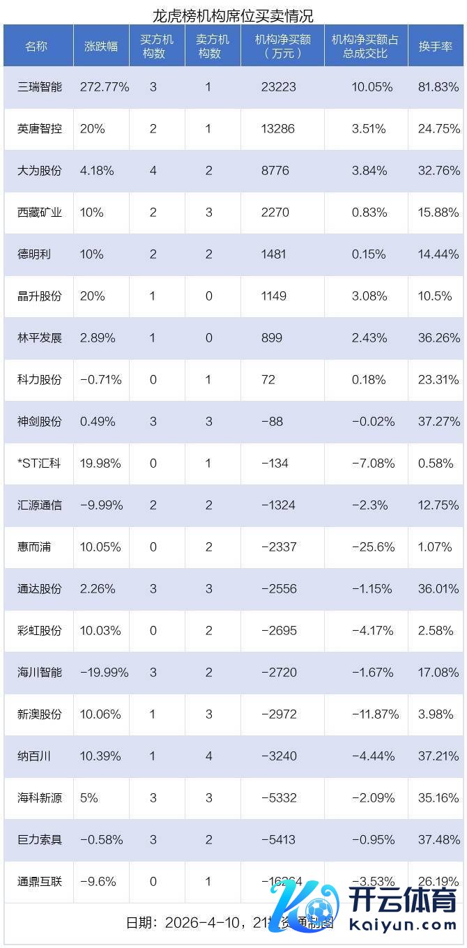 其中,机构净买入金额最多的是三瑞智能(301696.SZ),当日收盘高潮272.77%,换手率为81.83%。
